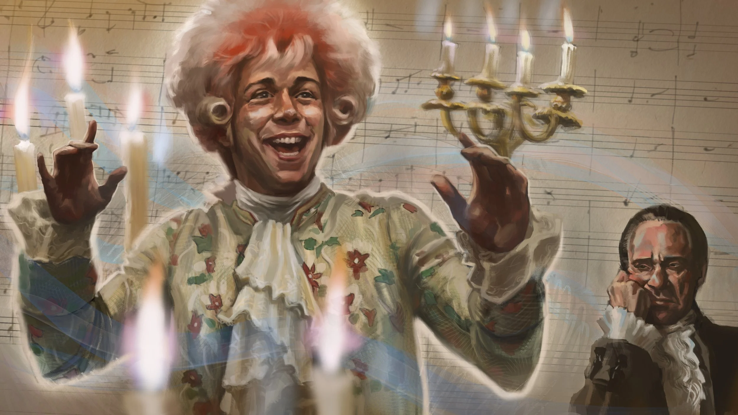 After sweating it out, eventually I got something that looks like Tom Hulce. It wasn’t so hard to nail down F. Murray Abraham’s Salieri. He has a well defined face. I added him as a rather on-the-nose manner in the corner to emphasize his silly behavior.